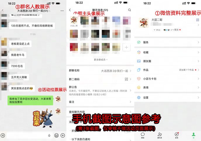分享个人游戏微信群内为活动拉票的截图,截图需清晰展示微信号,以证明您为该社群管理员,且社群人数需满足五十人以上。具体示例可参考以下示意图,快来发动社群力量,为活动助力吧!