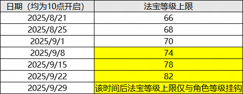 法宝等级上限与角色等级挂钩。此外,9月29日前,法宝等级上限还与日期挂钩,以角色等级对应的上限值和日期对应的上限值中的较小值为准,日期具体调整如下表:
