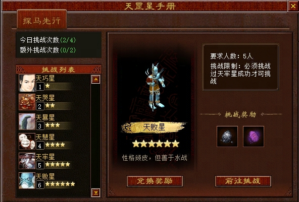 天罡星挑战副本难度较高,暂时投放6个天罡星以供挑战,后续将逐步放出更多不同难度的天罡星。少侠每天可以挑战4个带有经验、星符、法宝培养材料和积分/奖章奖励的天罡星,外加2个仅可获得星符奖励的天罡星。积分/奖章可兑换随机道具奖励,有机会获得神兽属性卡碎片、随机神兵、凝魂珠(天书)等好礼!
