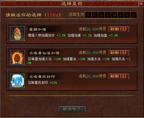 星符为天罡星战斗内专属生效的属性加强类道具,目前只在天罡星系统有效,可装备增强人物以及召唤兽,星运为增强星符效果使用,两者每周日24点都会清零重置。天罡星挑战结束后,选择星符界面的倒计时延长至2分钟,同时刷新星符的师贡也将降低为20000师门贡献。