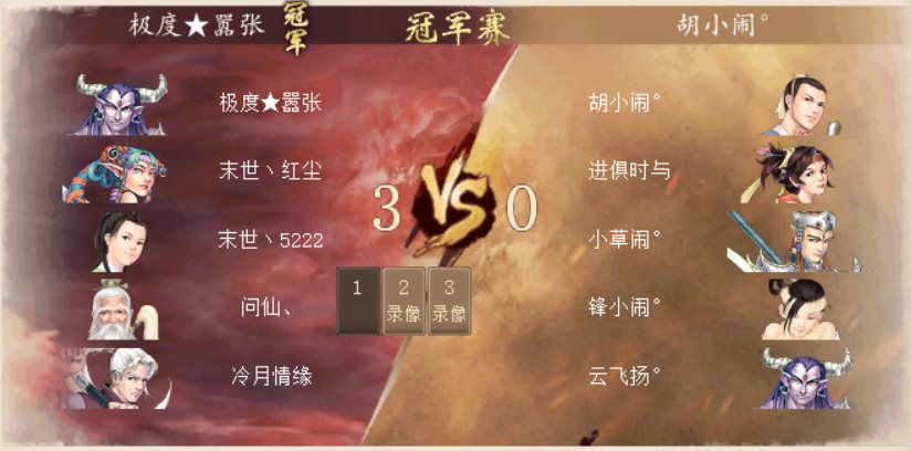 冠军战中,“极度★嚣张”带领的队伍自天干组中晋级,“胡小闹°”率领的战队则是从地支组中突围,而“极度★嚣张”一方在五局三胜的赛制下连胜两场,同时由于自带1个胜场积分,所以他们最终以3:0的总比分荣获冠军!
