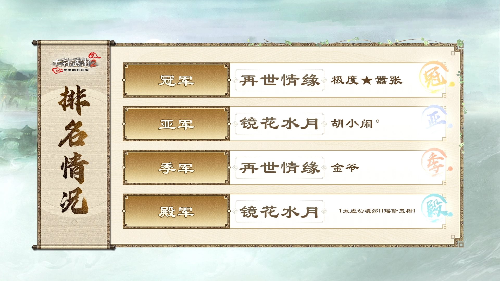 恭喜再世情缘服务器“极度★嚣张”率领的战队赢得冠军、镜花水月服务器“胡小闹°”带领的队伍获得亚军、再世情缘服务器“金爷”率领的战队获得季军、镜花水月服务器“1太虚幻境@II瑶阶玉树II”率领的队伍获得殿军,恭喜以上战队及选手!