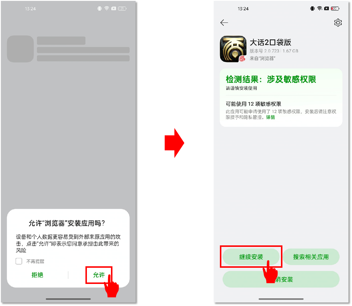 2、安装过程中,若出现如下图所示提醒,请先点击【允许】安装,再点击【继续安装】即可完成官方安全稳定包体的下载。