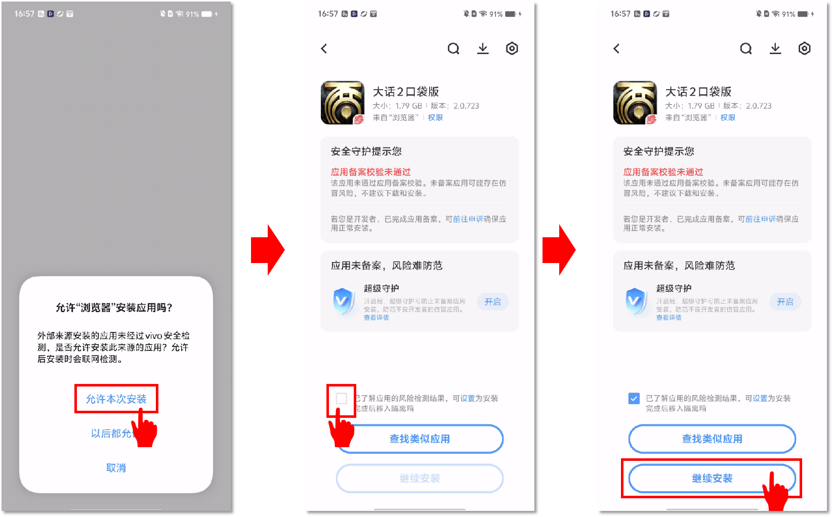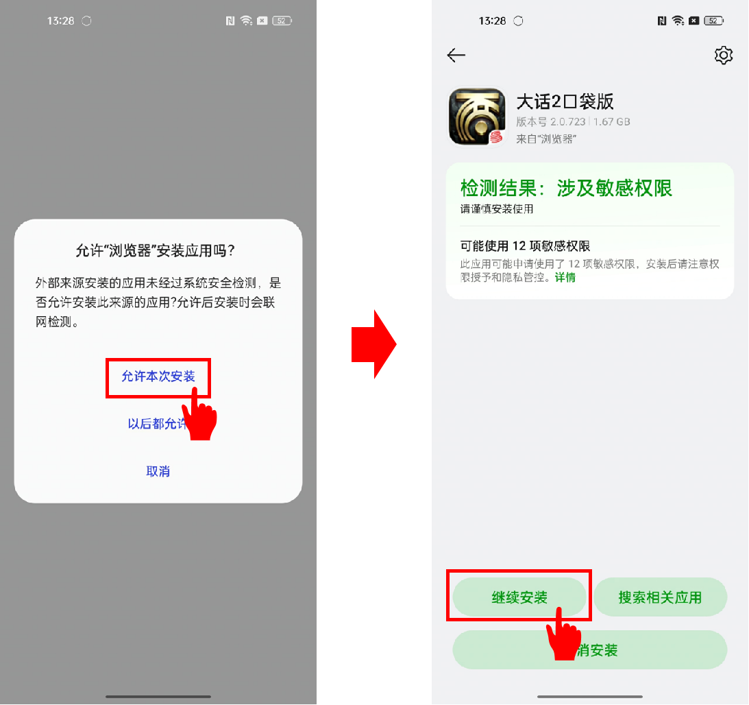 2、安装过程中,若出现如下图所示提醒,请先点击【允许本次安装】,再点击【继续安装】即可完成官方安全稳定包体的下载。