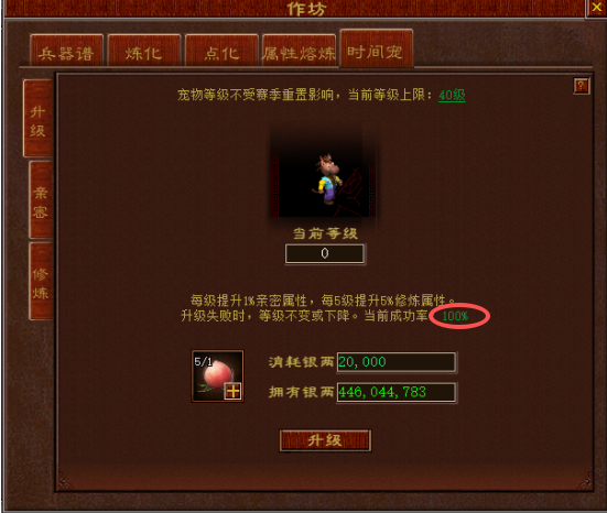 在【升级】界面,玩家需要使用道具“宠物灵桃”来提升时间宠的等级。每提升一级,时间宠的亲密属性会增加1%,每提升5级,修炼属性则会增加5%。不过,时间宠在食用宠物灵桃时,并非每次都能成功升级,存在升级失败的情况。失败时,时间宠的等级可能保持不变,甚至会有所下降。时间宠每5级为一循环,升级成功的概率为100%/100%/60%/40%/30%,同时界面也会给出相应的提示,让玩家心中有数。