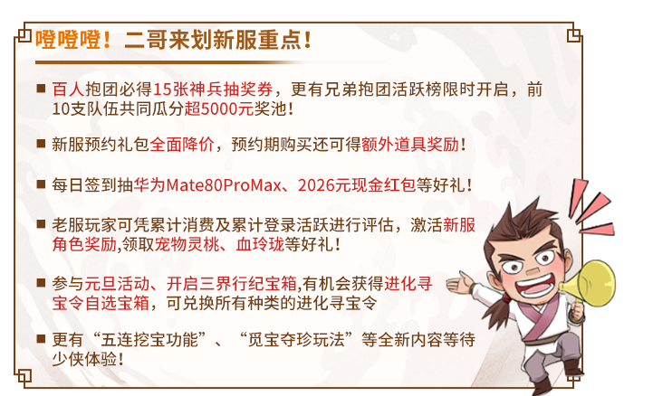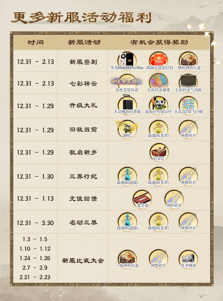 参与跨年新服『灯火耀九州』开服活动还有机会获得华为Mate80Pro Max、2026元现金红包等实物好礼!