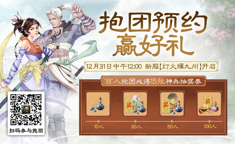 兄弟抱团预约活动火热上线中,入团无门槛,最低3人成团领奖!活动开启至12月31日上午10:00,邀请好友一同抱团预约跨年新服『灯火耀九州』,达到成团人数的成员都可获得限定抱团奖励,共计六大档位抱团人数好礼(3/5/10/30/50/100人),奖励还可叠加,百人抱团必得15张神兵抽奖券!