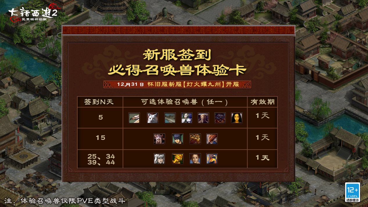 为了给少侠提供初期多样体验的召唤兽数值,降低培养负担,丰富新服体验,日常签到将投放体验召唤兽自选卡,使用后可以领取一只体验召唤兽(1天有效期),在PVE战斗中助少侠一臂之力!