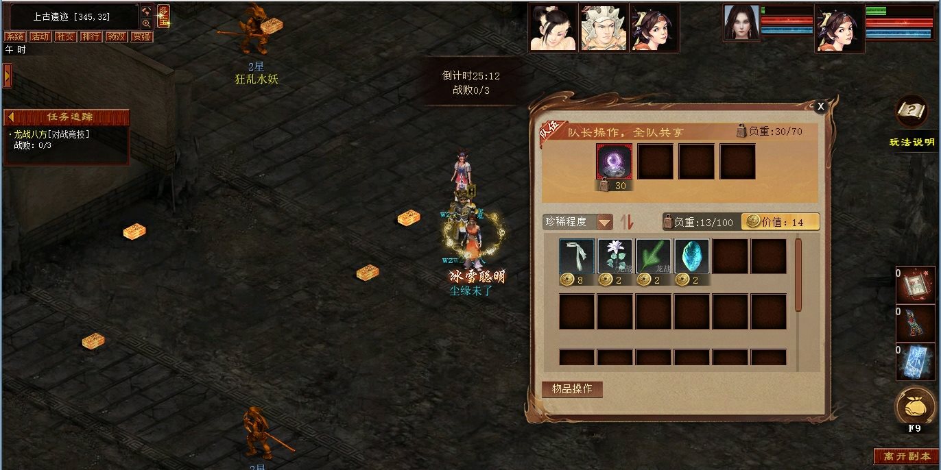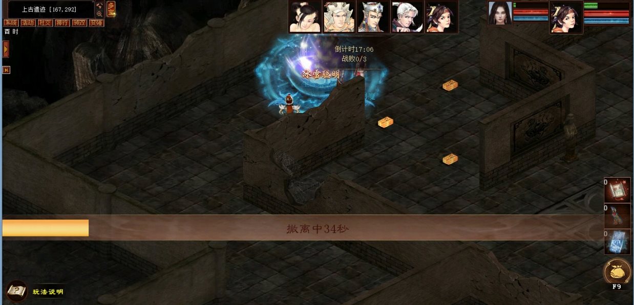 匹配成功后,少侠将进入上古遗迹场景。除召唤兽与身上装备外,其他道具均不可带入(可提前使用属性卡)。每场探险系统为每位少侠赠送5个海蓝石和5个夜叉石作为初始物资,如需更多药品、符文等物资,可在物资准备阶段,前往“剑魂货郎”(70,30、340,256)处购买。