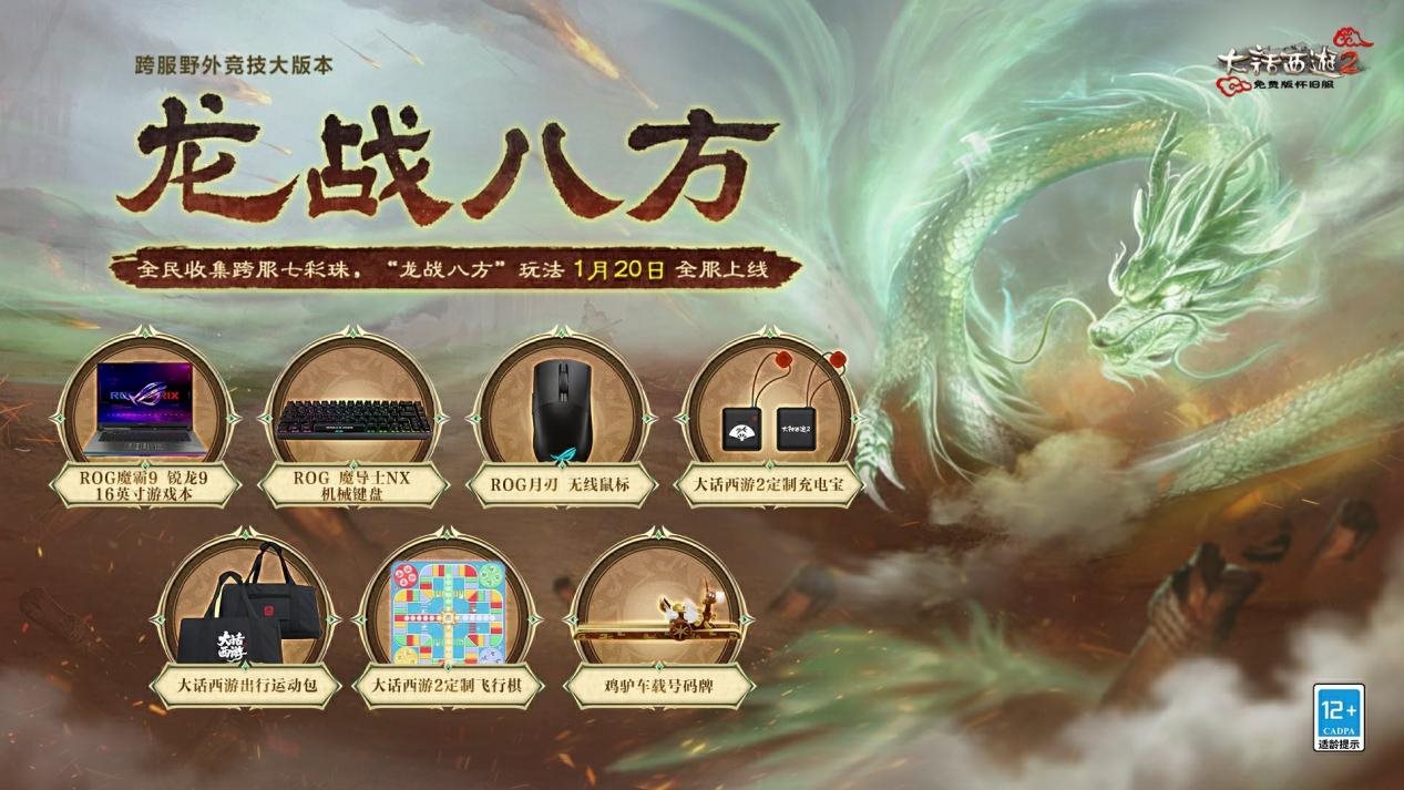 1月20日,跨服野外竞技大版本“龙战八方”正式全服,参与“龙战八方”玩法更有ROG魔霸9 锐龙9 16英寸游戏本、ROG机械键盘、ROG无线鼠标等实物好礼掉落,少侠记得喊上兄弟一起组队开搜!