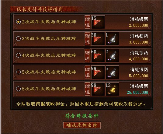 队伍需选择跨服方案,不同方案对应不同可战败次数,且在跨服后会赠送相应道具。仅队长支付跨服费用,全队成员需缴纳押金,用于预支切磋失败的银两损失。切磋失败不损失经验,且银两损失相较于单服野外战斗失败消耗的更低。
