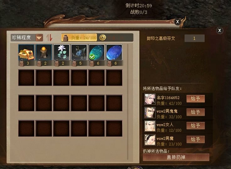 不需要的道具可给予队伍中的其他成员,但是不可超过其负重,否则无法给予成功。