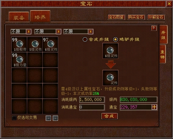 维护后,4级及以上的属性宝石可通过鸡驴升级方式提升等级