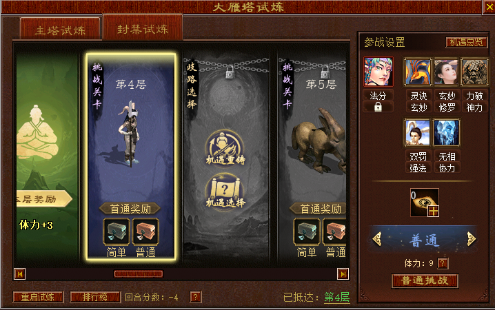 3)排行榜:优先以通过的普通难度层数排行,其次以回合分数进行排行(通过简单模式不会刷新排行榜成绩),通过层数越高、回合分数越低的排位靠前。